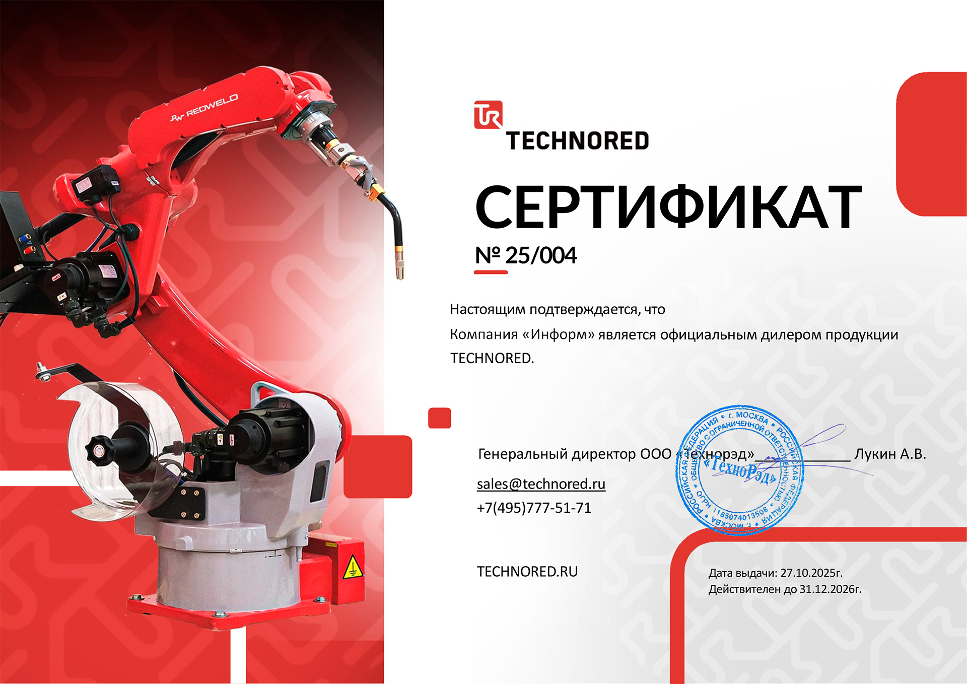 Компания «Информ» является официальным региональным партнёром-интегратором продукции TECHNORED, что подтверждено соответствующим сертификатом производителя.